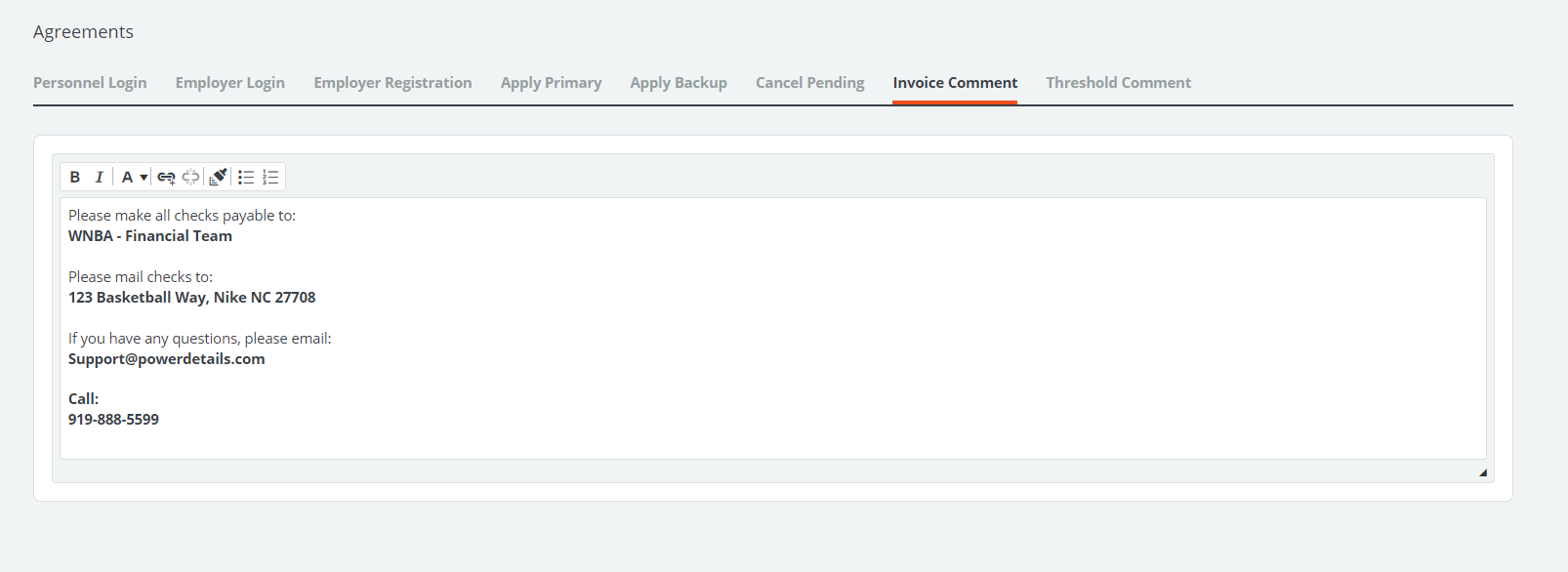 By navigating to invoices, administrators and personnel admins can manually alter the comments to appear on an invoice. Additionally, administrators can preset language in the agreements section for comments to automatically appear on invoices.